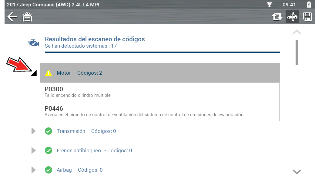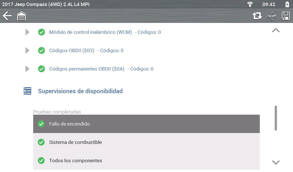 El escaneo de códigos/informe del sistema del vehículo incluye lo siguiente:
