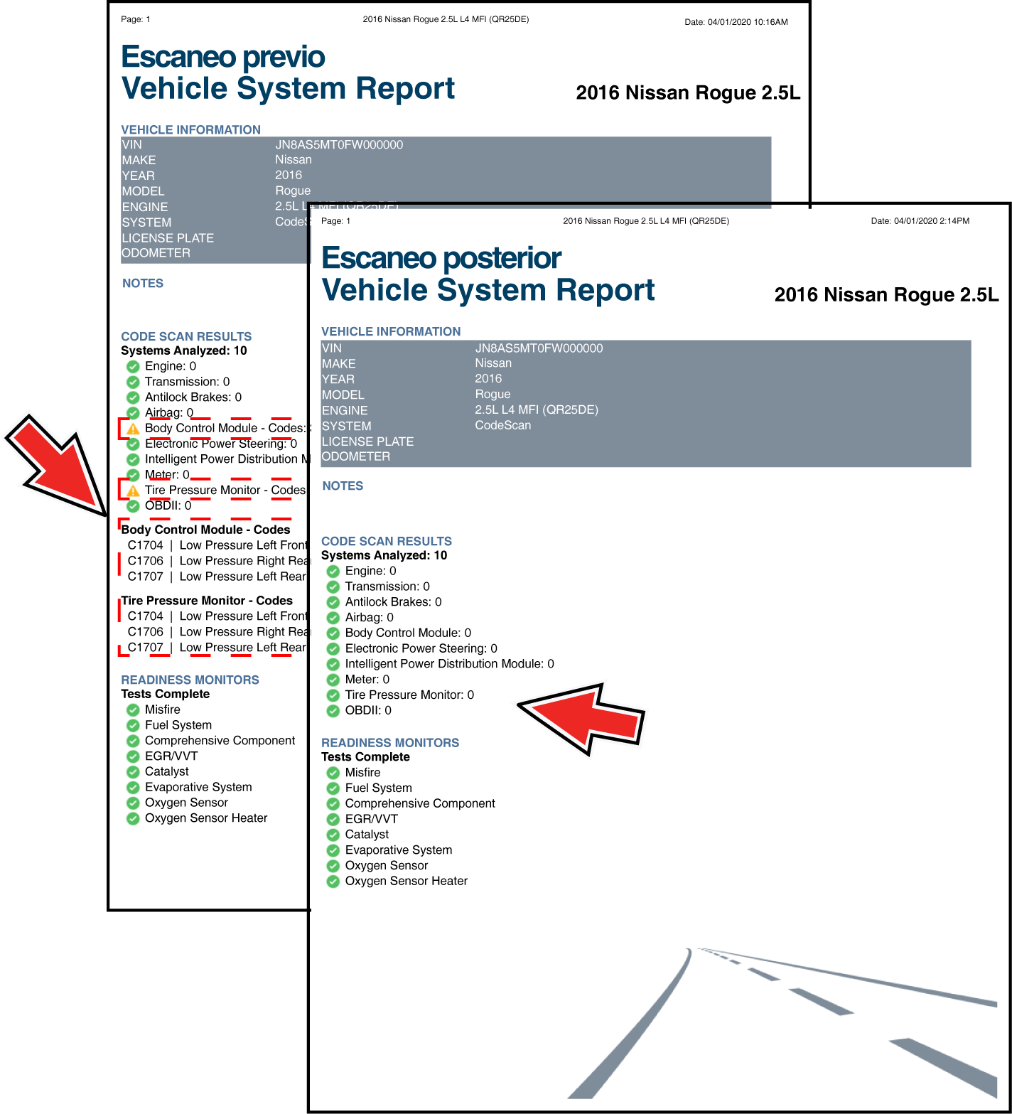 Los escaneos previos y posteriores también le permiten registrar en formato de informe el estado previo del vehículo y comparar el escaneo posterior después de completar el trabajo para confirmar que las reparaciones se completaron correctamente.
