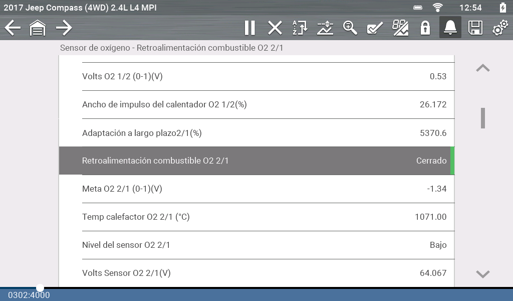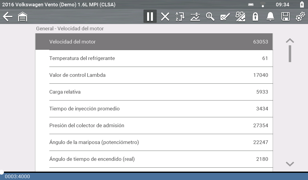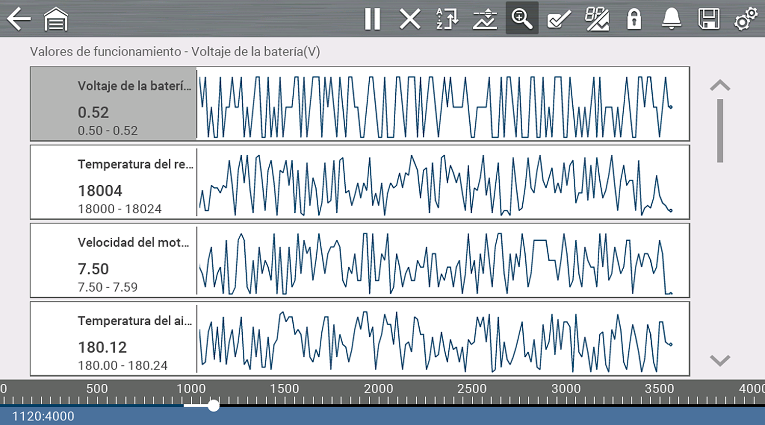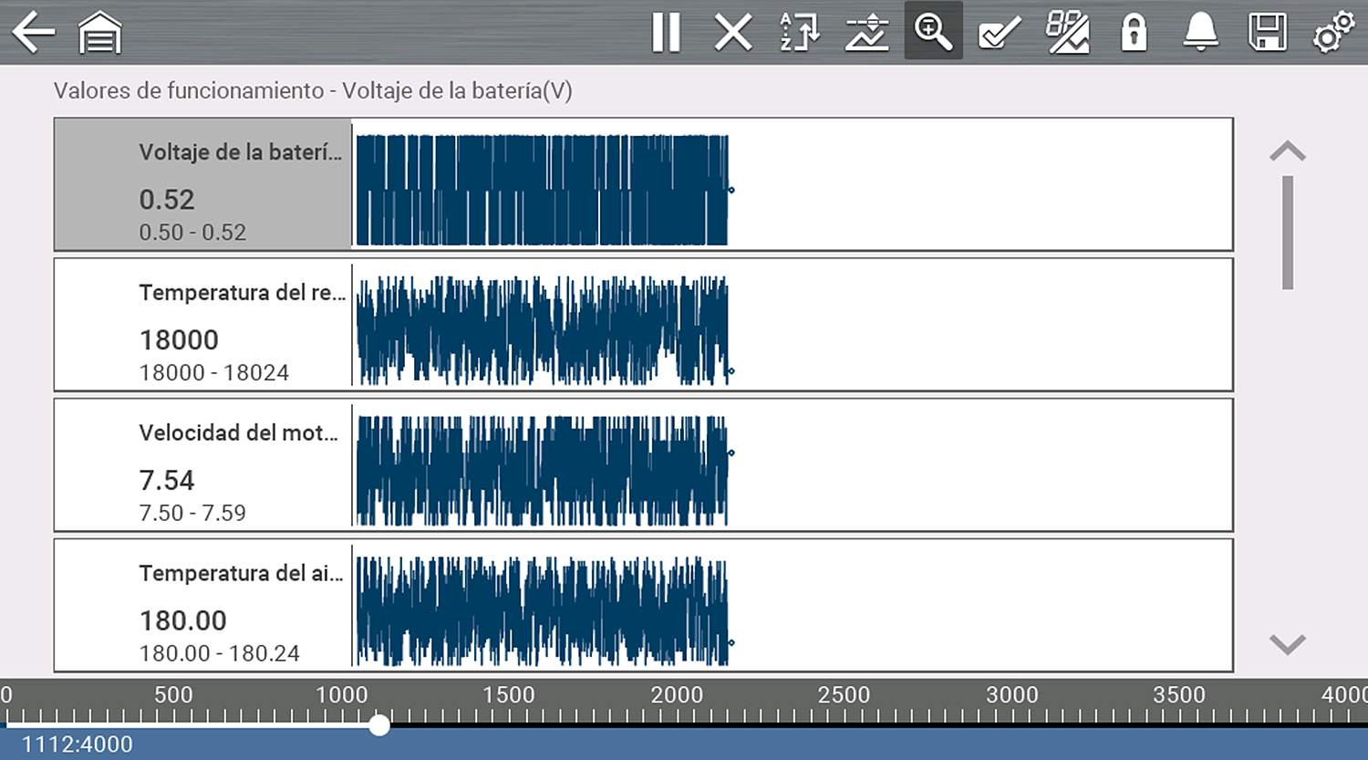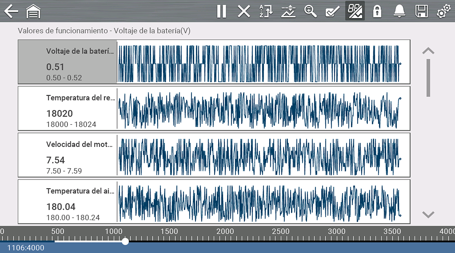 Durante el funcionamiento normal, los datos del vehículo se almacenan continuamente en la memoria del búfer como se muestra en pantalla.