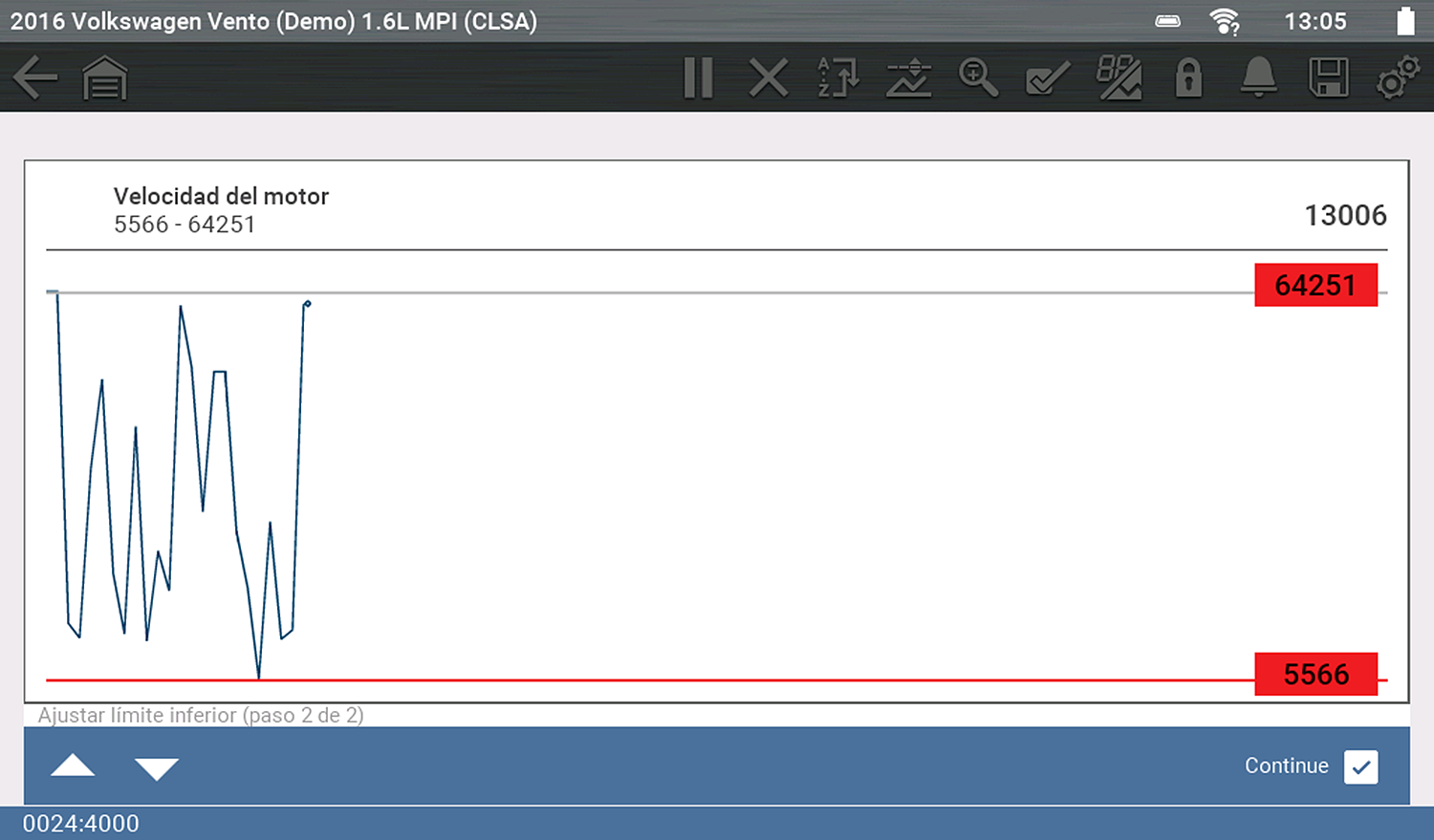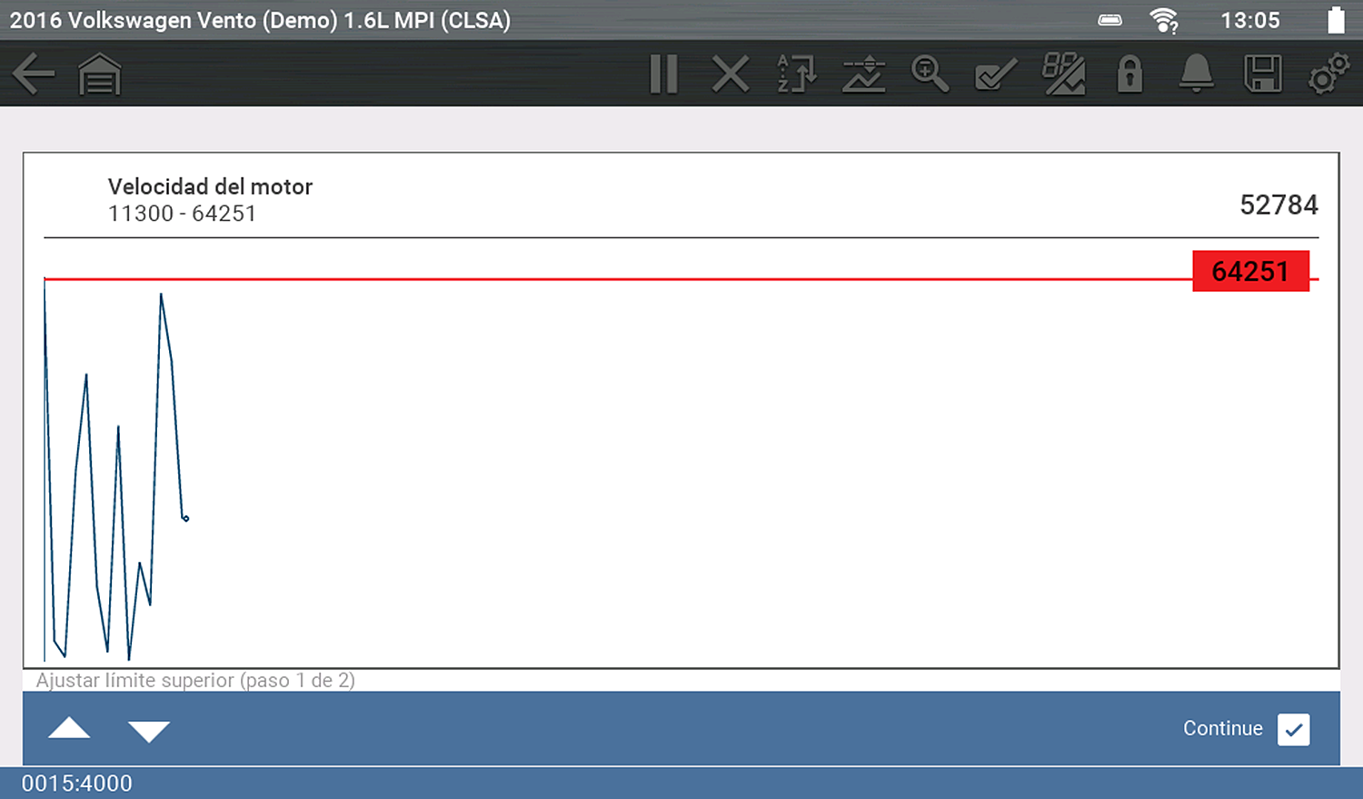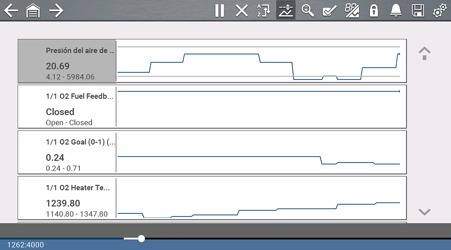 | ● | El cursor azul (vertical) muestra su posición en los datos y se indica mediante el valor de posición actual en la pantalla del contador. Este cursor se muestra en todos los PID. |