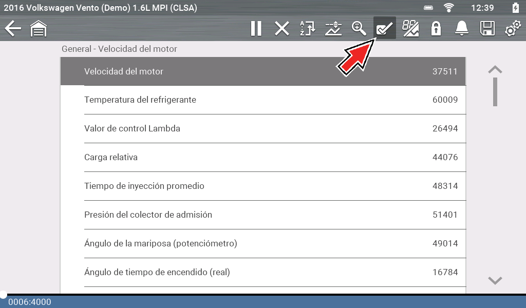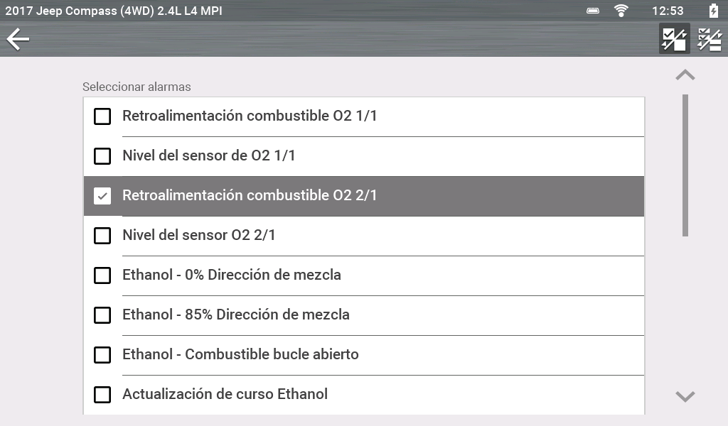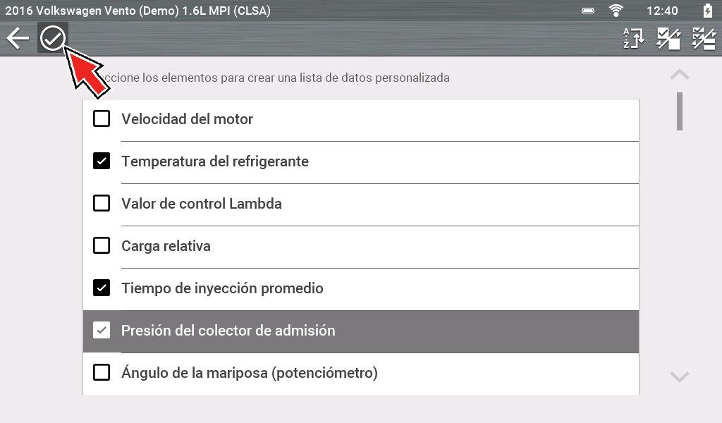 Seleccione las PID en las que desea activar indicadores y, luego, seleccione la flecha Back (Atrás).