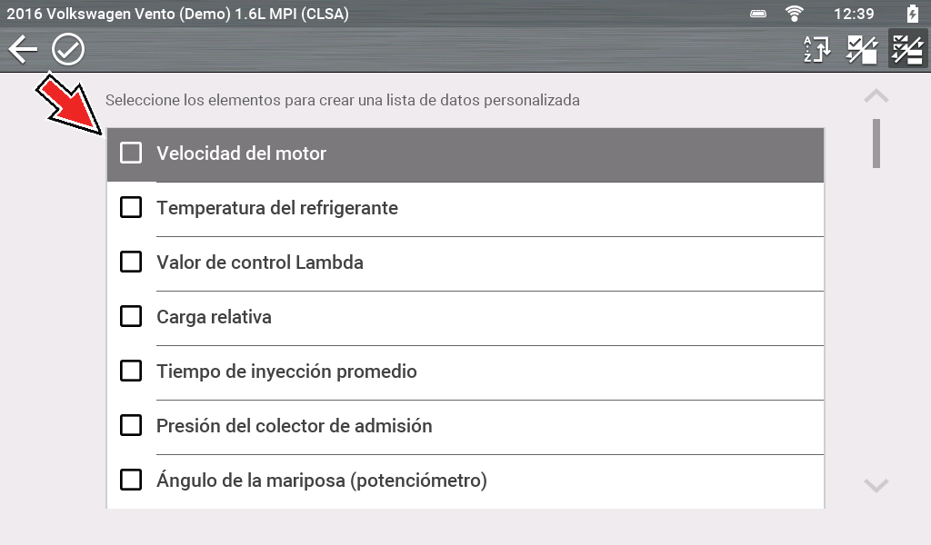 Se muestra la pantalla de selección de datos. Se proporcionan casillas de verificación a la izquierda de la descripción del parámetro para seleccionar los parámetros que se mostrarán.