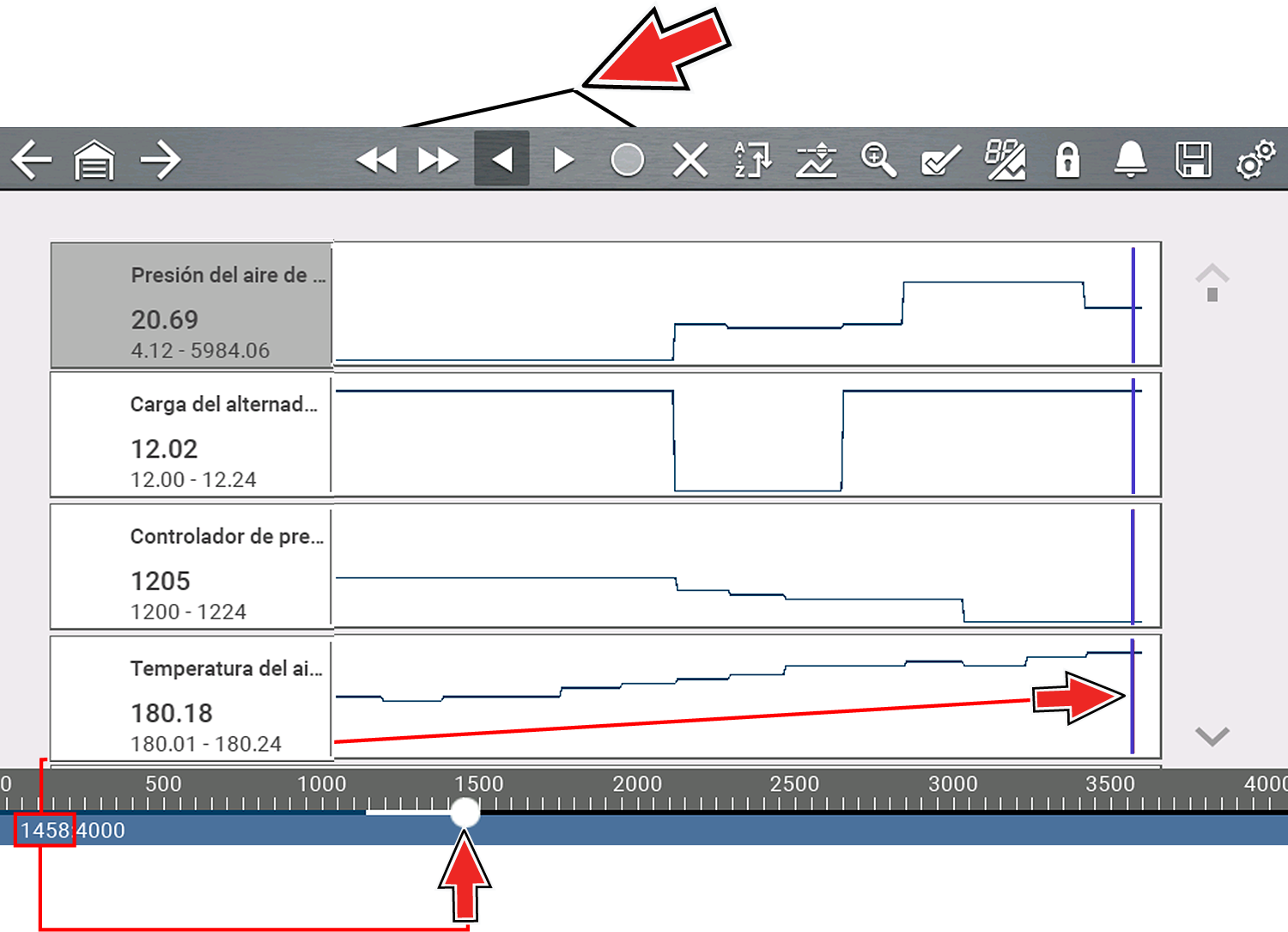 | ● | Según la cantidad de datos guardados, el cursor azul puede ubicarse inicialmente en el extremo izquierdo junto a la descripción o en el extremo derecho junto a la barra de desplazamiento, y resulta difícil de ver. Si esto ocurre, use los iconos de control (Avance/Omitir) para mover los datos hasta que pueda ver el cursor. |