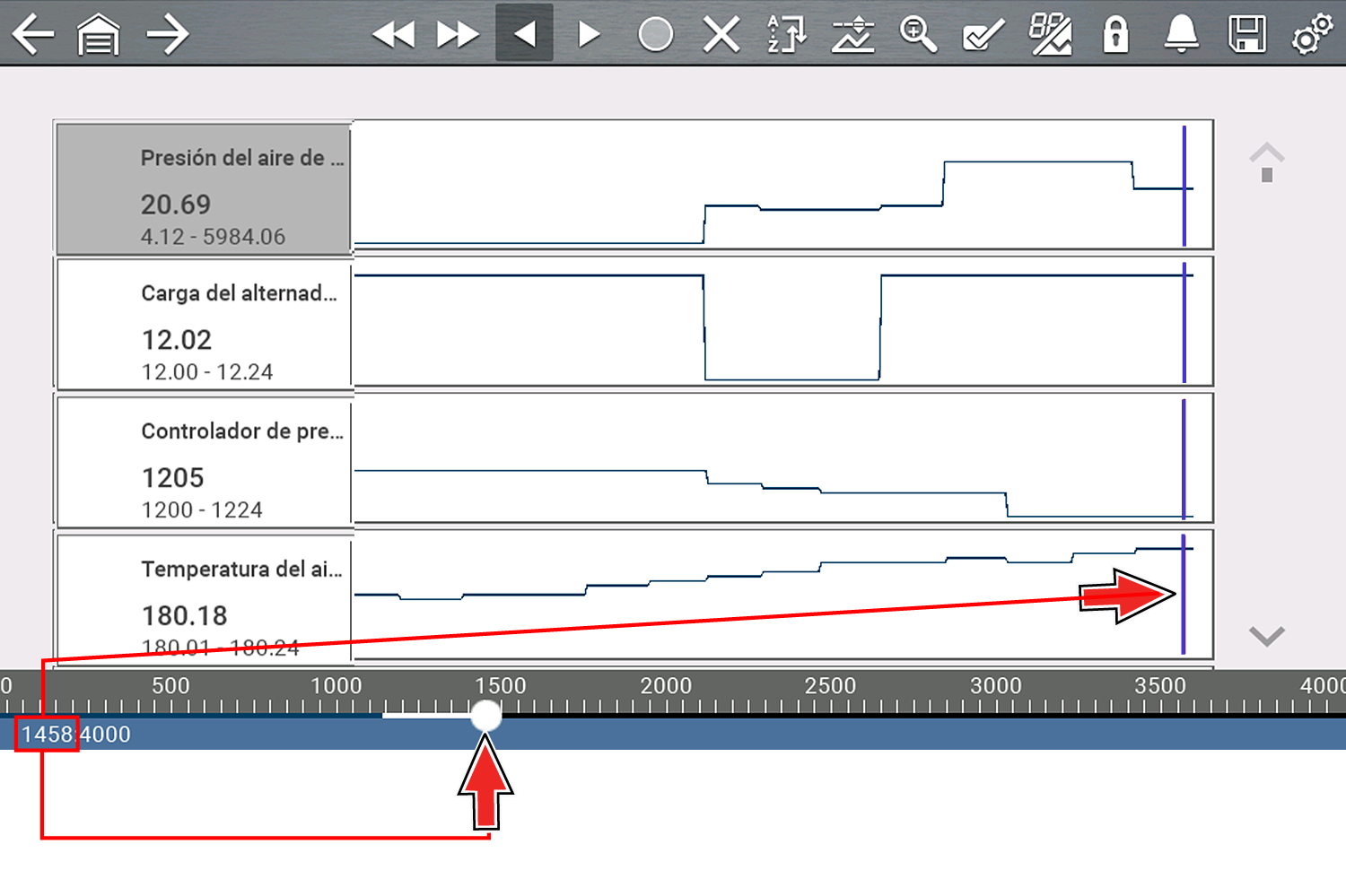 Según la cantidad de datos guardados, el cursor puede ubicarse inicialmente en el extremo izquierdo junto a la descripción o en el extremo derecho junto a la barra de desplazamiento y resulta difícil de ver. Si esto ocurre, use los iconos de control para mover los datos hasta que pueda ver el cursor.