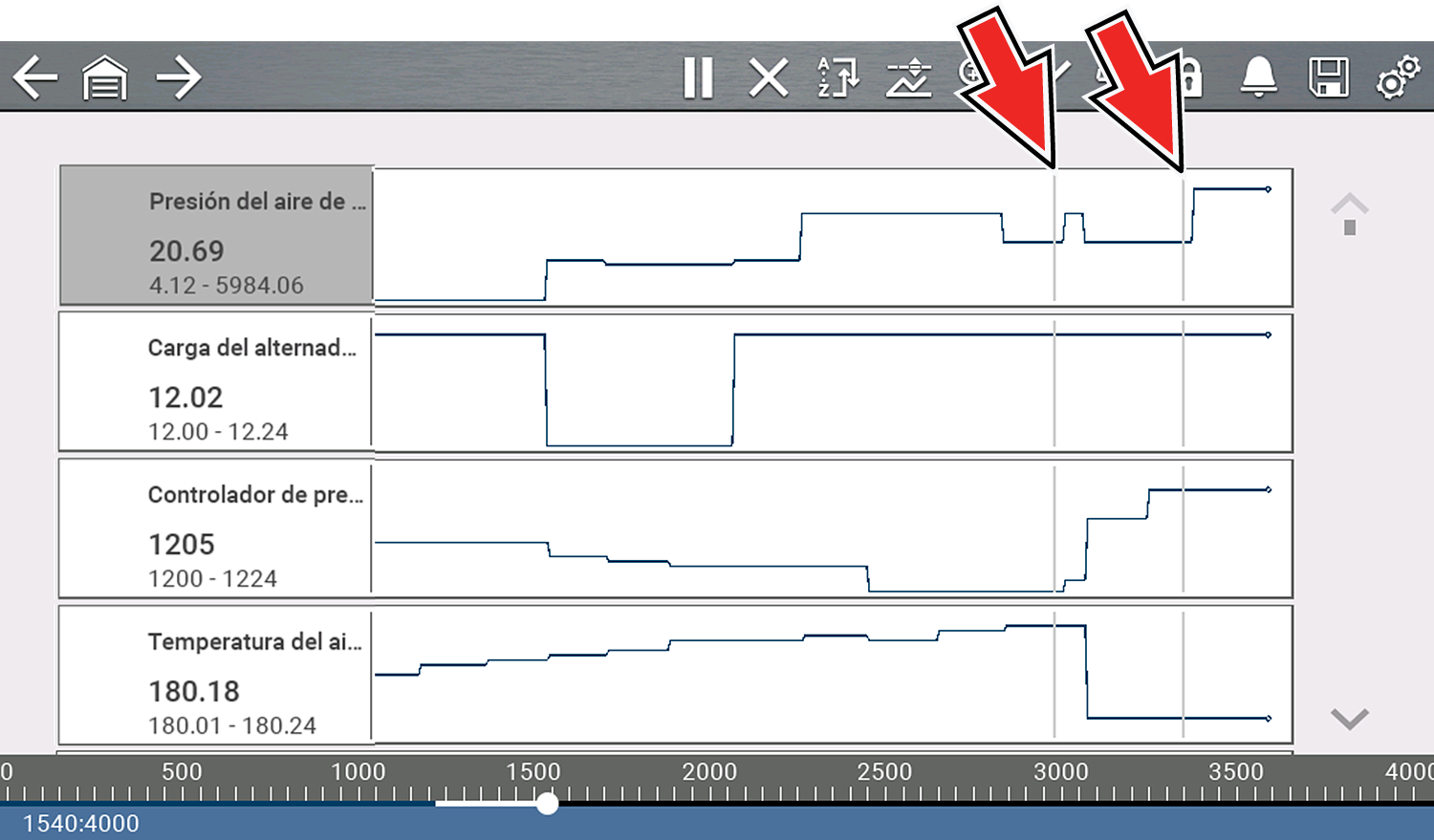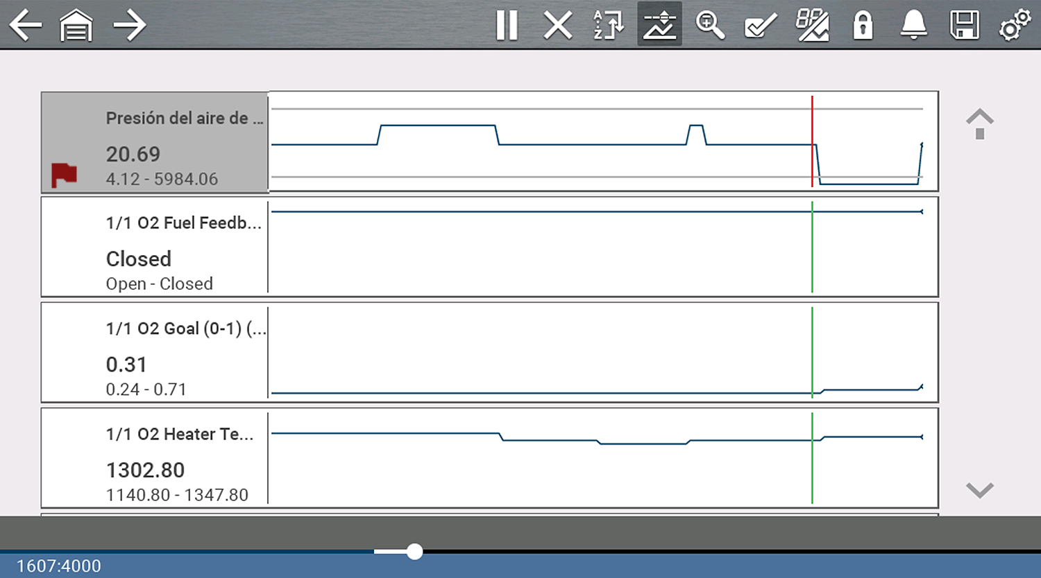 | ● | Un marcador vertical gris se muestra en todos los PID para indicar dónde se pausaron los datos. Si presiona Pause (Pausar) más de una vez, los marcadores grises se utilizarán para cada instancia. |