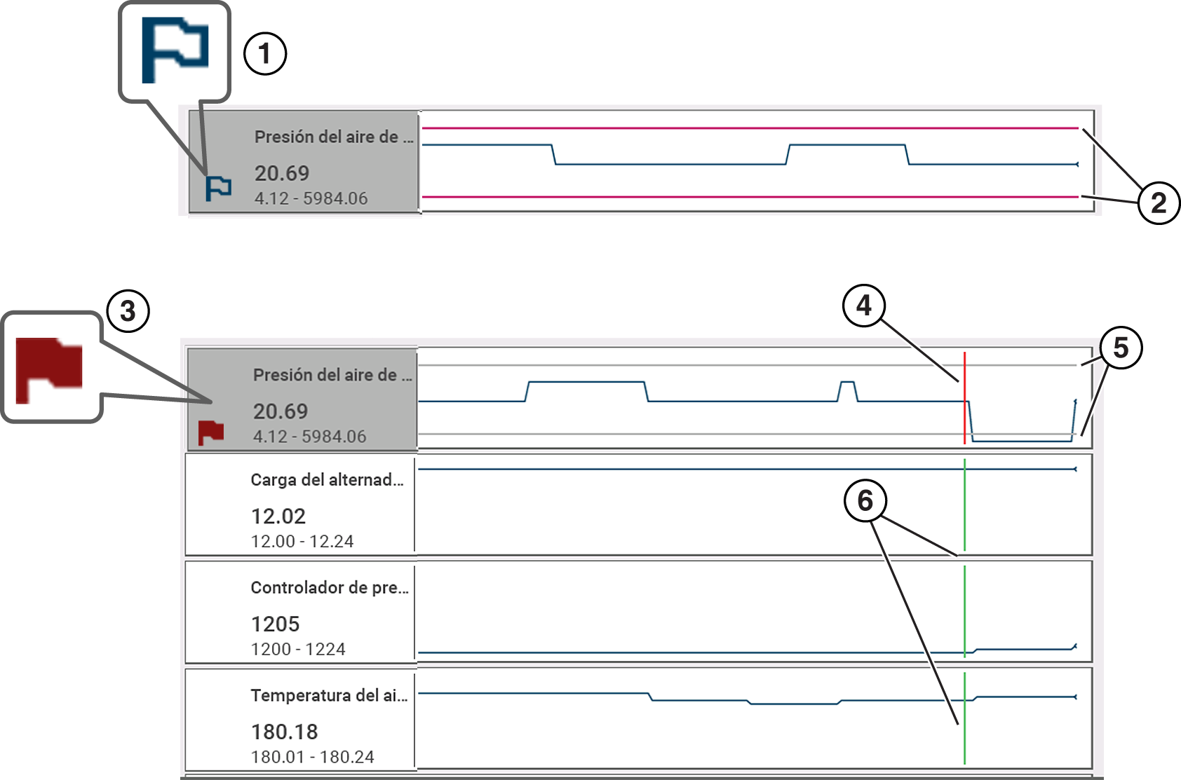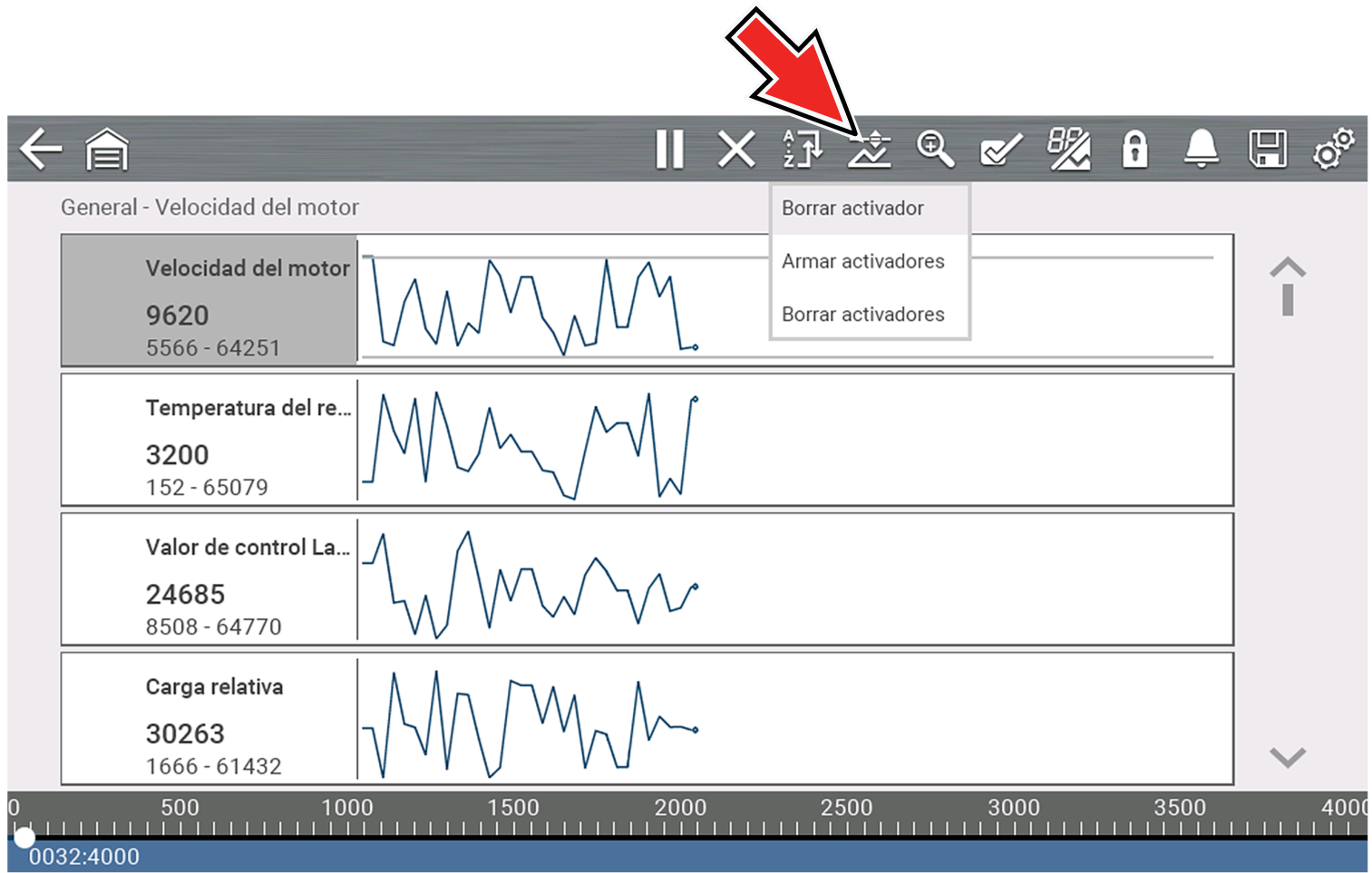 | ● | Cuando se activa un disparador, los marcadores rojos y verdes que se muestran están alineados verticalmente en los datos graficados para mostrar la relación del punto de disparo en todos los PID. |
