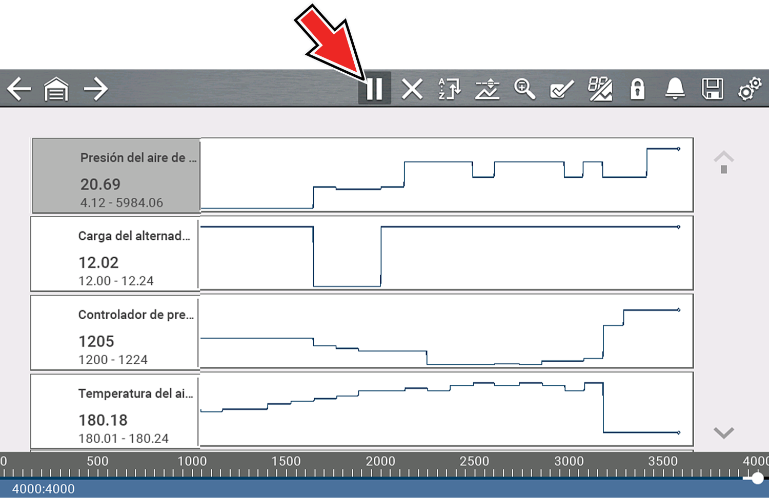 Pause (Pausar), le permite pausar temporalmente la recopilación de datos para revisarla en detalle.