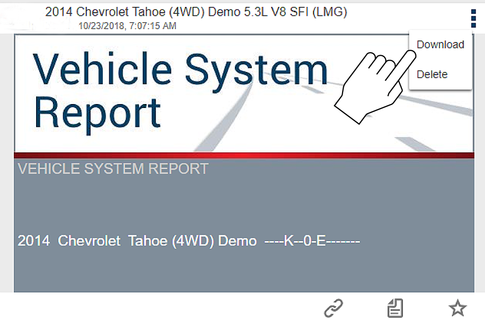 Busque el informe del sistema del vehículo que desea imprimir y, luego, seleccione el icono de menú de la tarjeta (extremo superior derecho). |