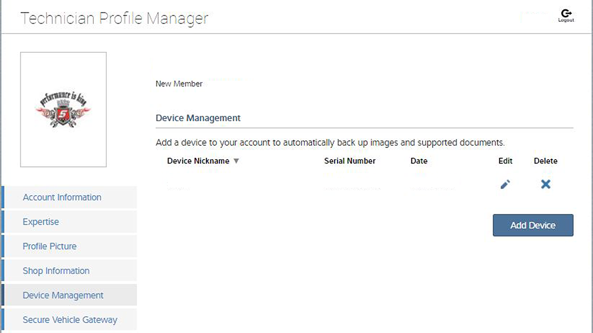 Si ya tiene un perfil técnico de Snap-on, inicie sesión y seleccione la pestaña Device Management (Administración de dispositivos). |
