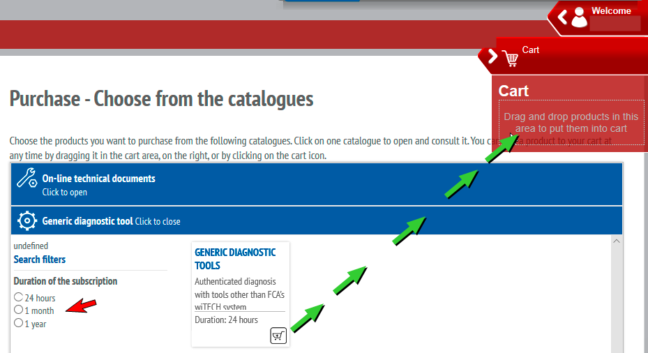 Seleccione la pestaña “Generic diagnostic tool” (Herramienta de diagnóstico genérica) y, luego, elija el período de suscripción (por ejemplo, 24 h, 1 mes, 1 año, etc.). A continuación, arrastre y suelte la opción seleccionada en el carro de compras. |