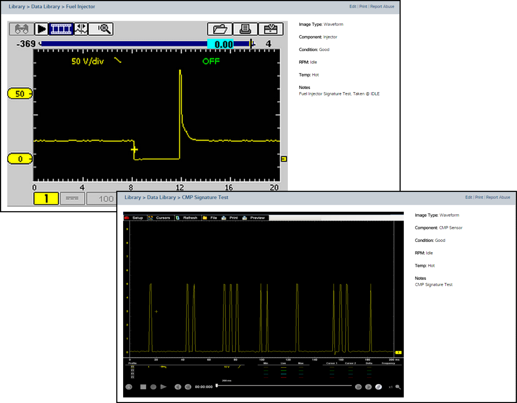In some cases captured waveforms may not provide enough information to determine if a suspected sensor or circuit is at fault. Comparing the test vehicle waveforms to known good waveforms, can help to provide supporting evidence when trying to determine a fault.