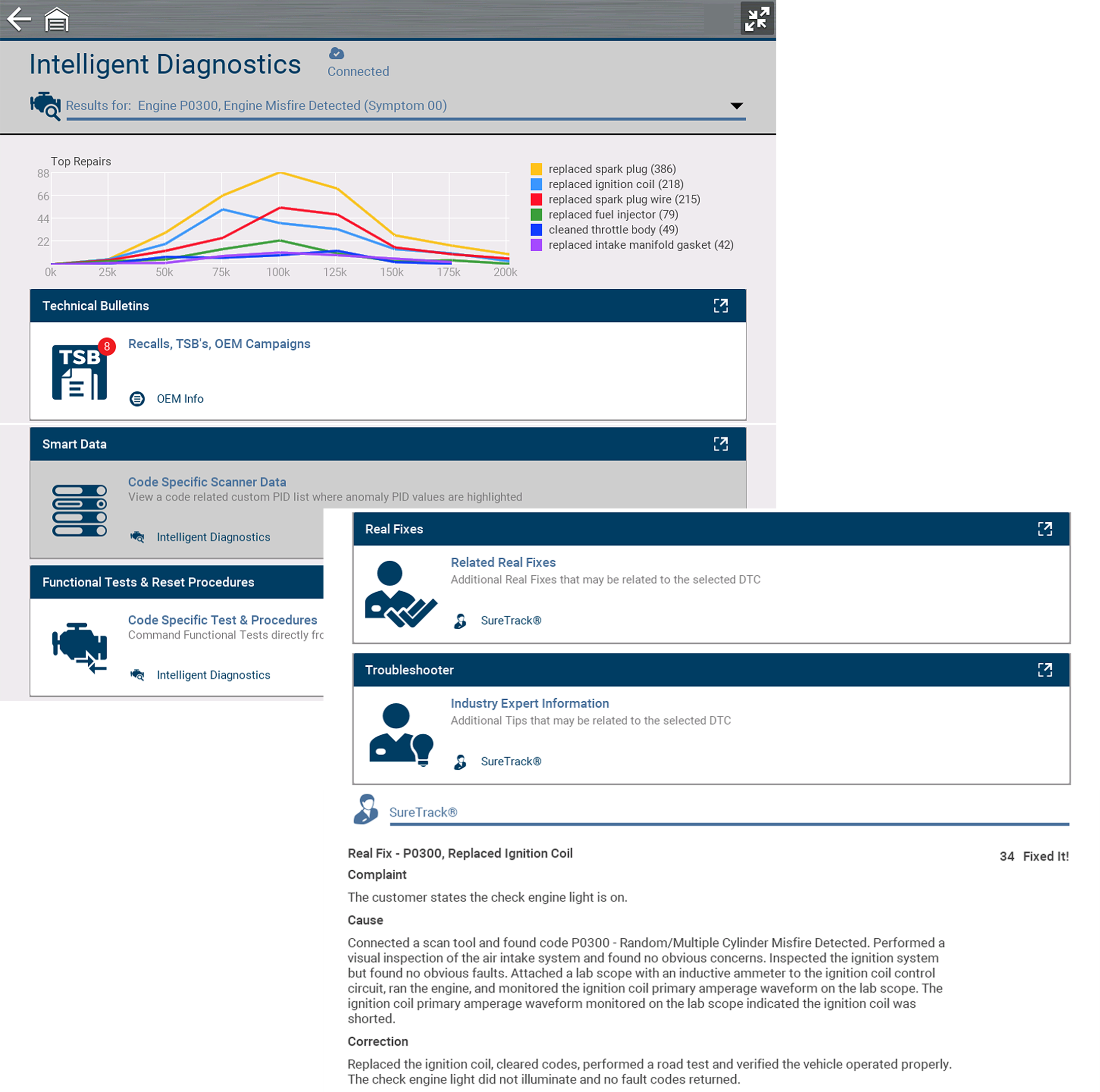 Fast-Track Intelligent Diagnostics saves you time by providing access to code related data, information, and tests, all from one screen. It allows you to quickly find TSB's, smart data PID lists, out-of-range PIDs, functional tests, Sure Track Top Repairs Graph and Real Fixes, and more all at a glance.