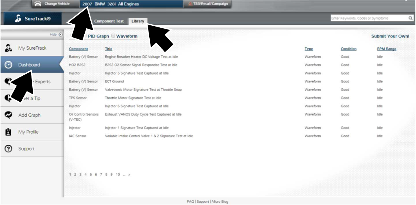 One of the many resources available within the optional online version of SureTrack is the comprehensive collection of known good component waveform examples gathered through actual vehicle tests. Waveform and PID graph screenshot examples are provided by fellow member technicians and shared with all members in a searchable (vehicle/component specific) database.