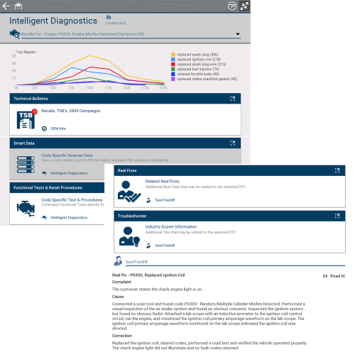 This feature is not applicable to all tools, and requires Wi-Fi connection. Fast Track Intelligent Diagnostics provides access to code related data, information, and tests, all from one screen when viewing codes in Scanner. Quickly find TSB's, smart data PID lists, out-of-range PIDs, functional tests, Top Repairs Graph and Real Fixes, all related to the selected code. In addition, you can directly access all (not just code related) PIDs and functional tests from one place, as compared to accessing them separately through the individual system menu. In this User Manual application, see Main Menu > Diagnostic Tool Functions > Intelligent Diagnostics for details. |