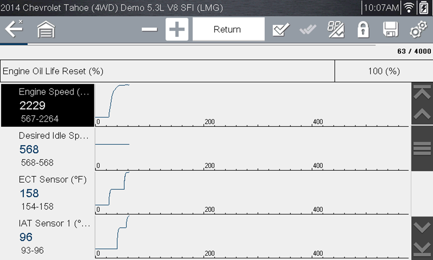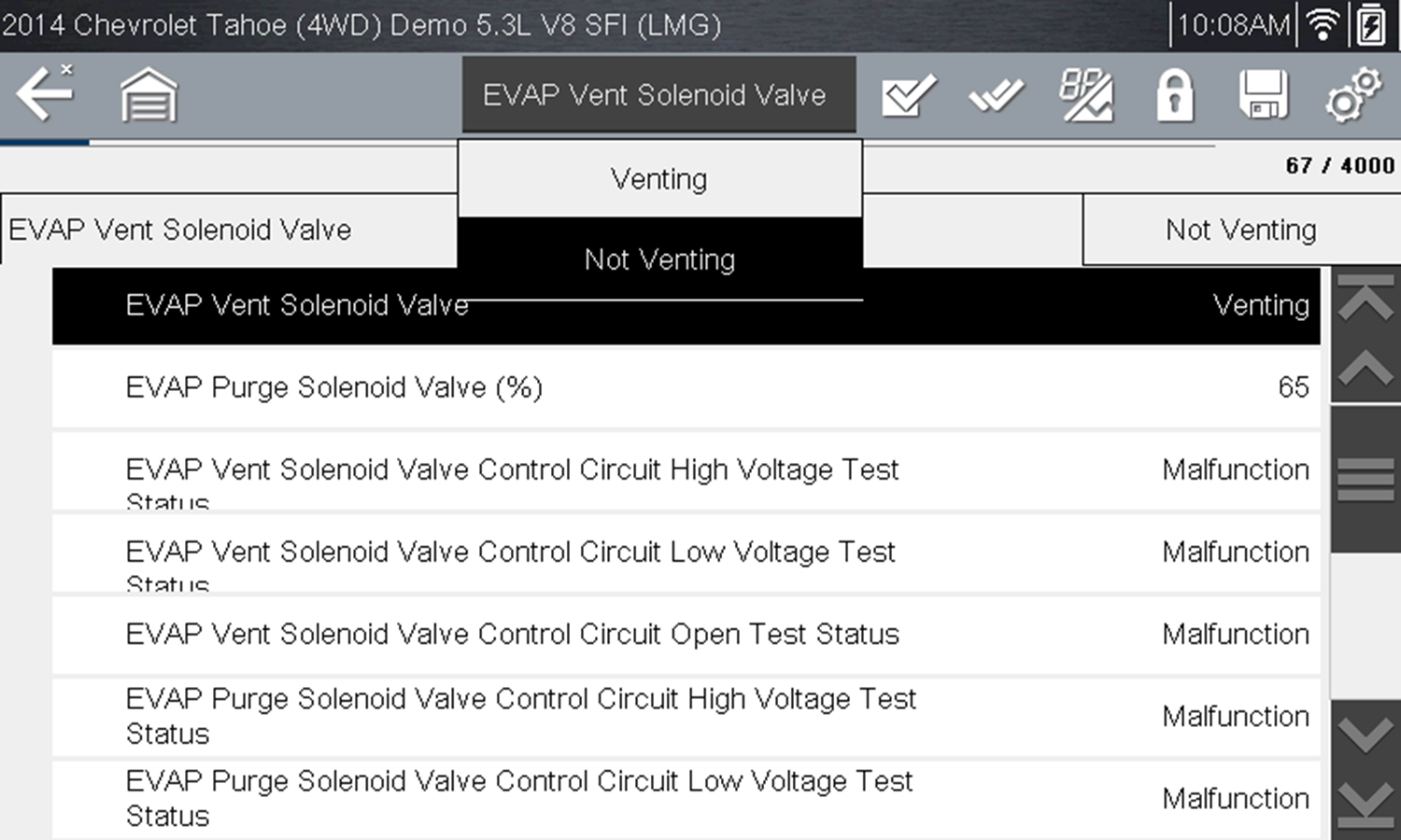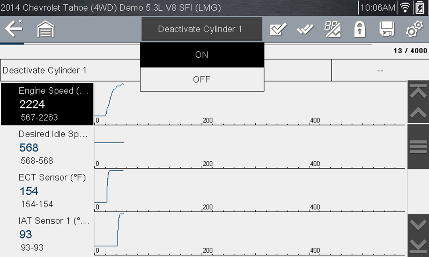 Toggle and variable control tests often display functional test controls on the toolbar at the top of the screen with PID data in the main body.