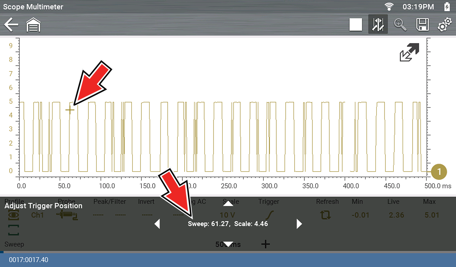 | 5. | Use the directional controls provided, or the thumbpad directional controls to move the trigger marker into position. Sweep and vertical scale values are provided in the trigger position control panel, which gives you the precise position of the trigger marker. |
