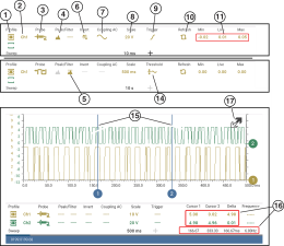 | 16. | Cursor Measurements Panel —displays signal amplitude at cursor and cursor position in time |