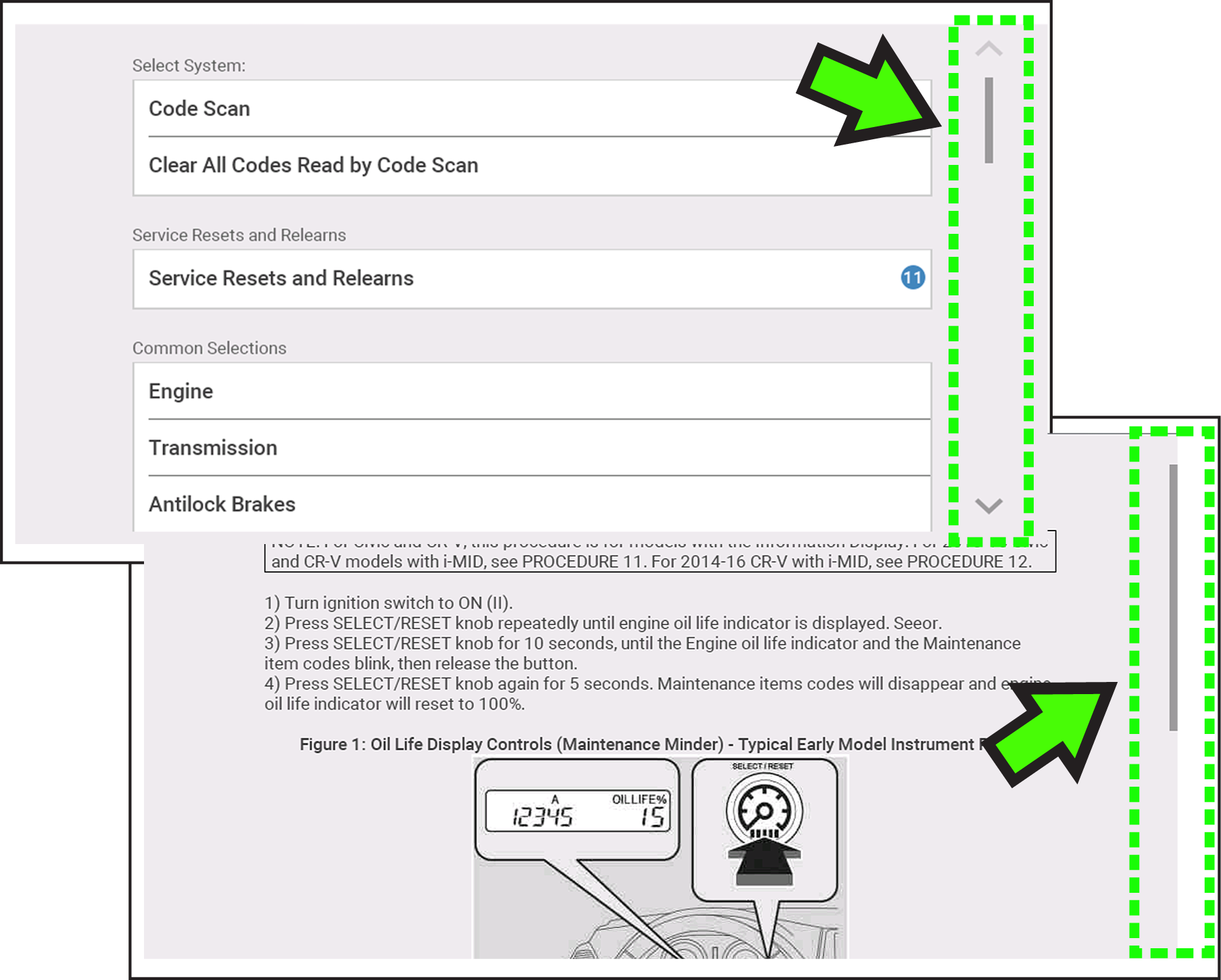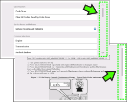 Provides quick access to the OEM Oil Specs and Resets and Tire and Wheel Service information and TPMS functions. |
