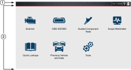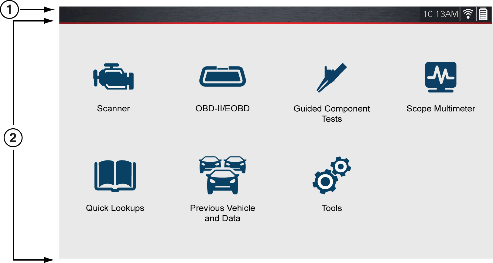 Each available diagnostic tool function is represented by a icon on the Home screen. Select an icon from the Home screen to start a function. You can also use the control buttons to select an icon. Use the directional button to highlight the desired function and then press the Y/Accept to select it.