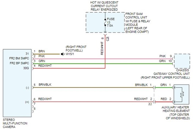 The multifunction camera is located on the windshield of this vehicle. Because this vehicle was in a collision, our thought is that the most likely causes would either be a camera left unplugged after a windshield replacement, a blown fuse that could have been shared with other components, or wiring that could have been damaged in the accident. After checking to make sure the camera was plugged in, we accessed the front SAM (Signal Acquisition Module) and verified that there was power on both sides of fuse 13.