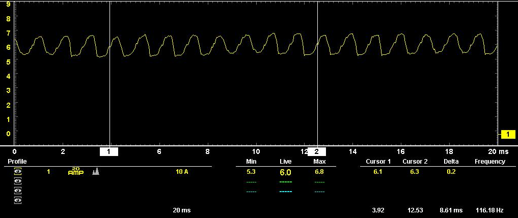 Figure 1 shows the current flow through a “brushed” fuel pump from a Ford Focus. The commutator has eight segments, each segment has a slightly different current profile. By identifying one segment we can use the cursors to calculate the time for one revolution of the pump. In this example the pump speed is 8.61ms for one revolution. This equates to almost 7,000 RPM. The calculation for this is, there are 60,000ms in one minute, so