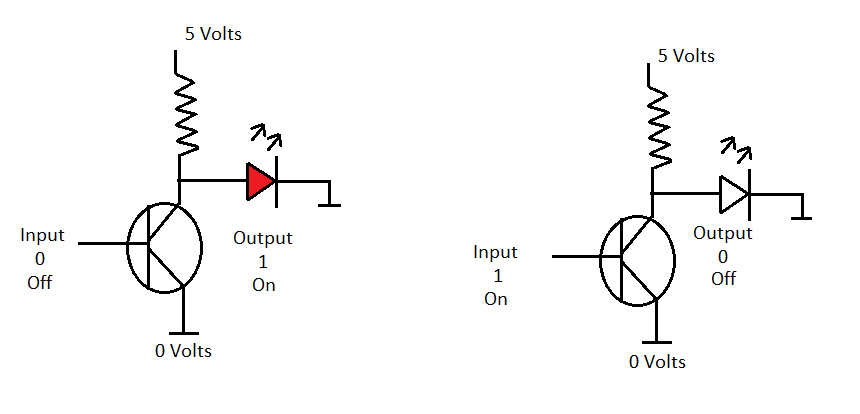 A NOT gate differs from both the AND/OR gates because there is only one input, as with other versions there is only one output. The NOT gate is also referred to as an inverter. This is because the output is the inverse of the input. When a logic 0 is applied to the base of the transistor, the output is logic 1. So when the transistor is switched off, a voltage is available at the output point. The reason this device works is because the resistor is connected between the 5 volt supply and the collector of the transistor. Note, there will be no volt drop across the resistor if current is not flowing within the collector/emitter circuit. When the transistor is switched off there is no path to ground for the current to flow.