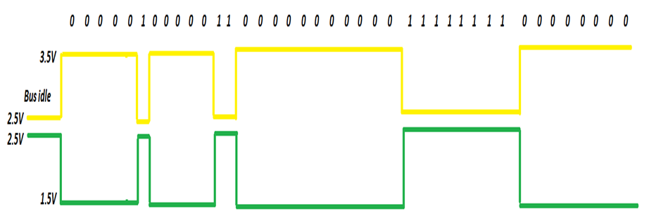 CAN bus uses a different method to assign a numerical value to the bus voltages. A dominant bit, of zero is set, when the CAN High voltage is 3.5 volts and the CAN Low voltage is 1.5 volts. The recessive state, given a value of 1 is when the voltage on both CAN High and CAN Low is 2.5 volts.