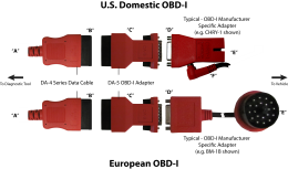 | ● | An optional OBD-I data cable adapter (DA-5) is available, which allows connection of the supplied DA-4E (OBD-II/EOBD) cable to the DA-5 adapter. The DA-5 adapter connects to the manufacturer specific OBD-I adapter. This may be used instead of the optional OBD-I data cable. Part# EAA0355L93A |