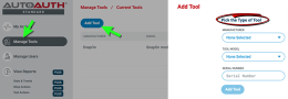 | 6. | Select Manage Tools > Add Tool, then enter your Snap-on diagnostic tool model and serial number and save the entry. |