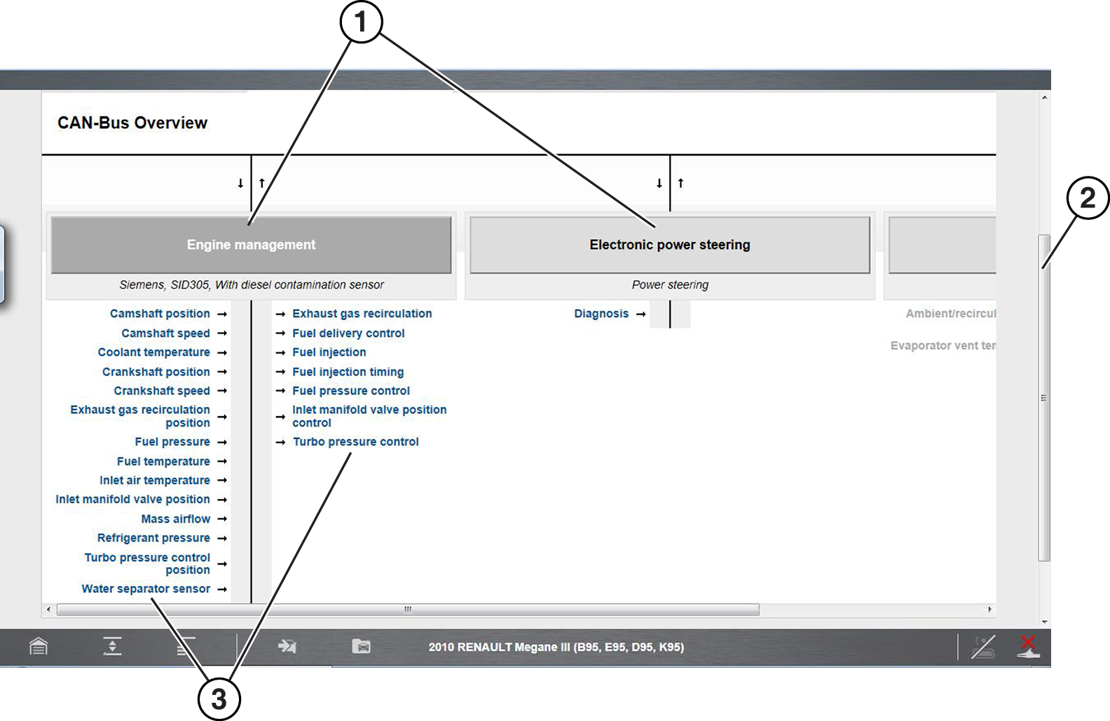 | 1. | Submenu Panel—contains available electrical information category options. Select a tab to view the results. |