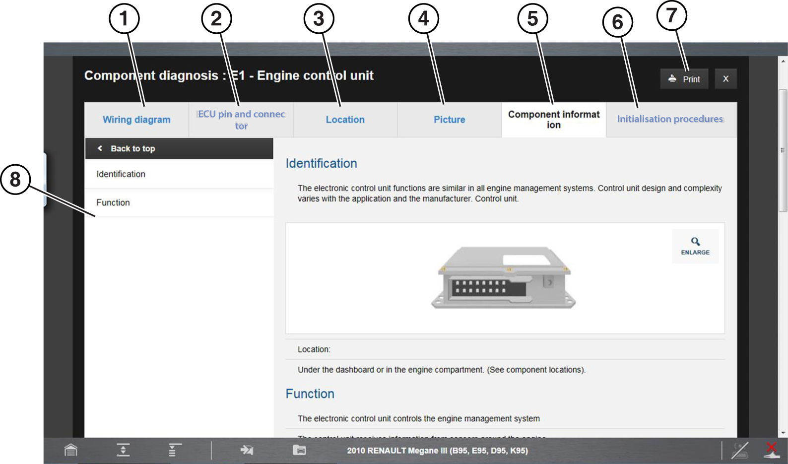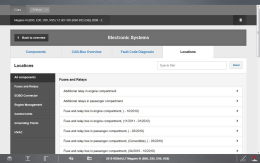 The Locations features provides vehicle specific electrical component location information. Descriptive and visual (e.g. diagrams and schematics) reference may be provided for the following types of system components: