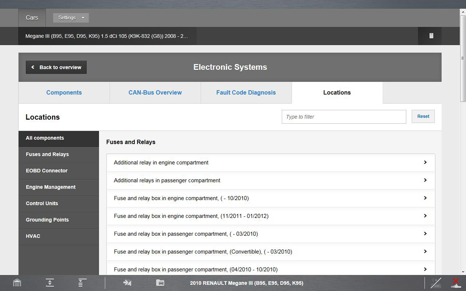 Locations allows you to quickly pick or search for specific component location. Components are categorized in the left menu panel and results are shown in the main screen. Filter your search either by selecting from one of the menu items or entering a keyword to search in the search field.