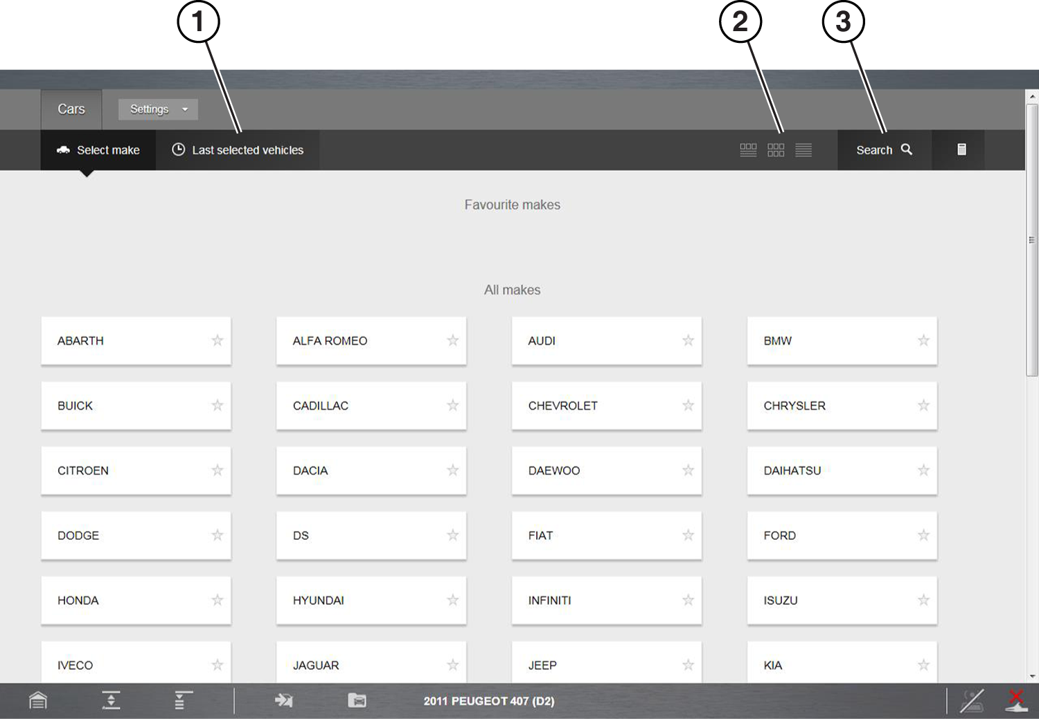 | ● | Favorites/Full List—toggles the displayed vehicle make list between the full and favorites list views |
