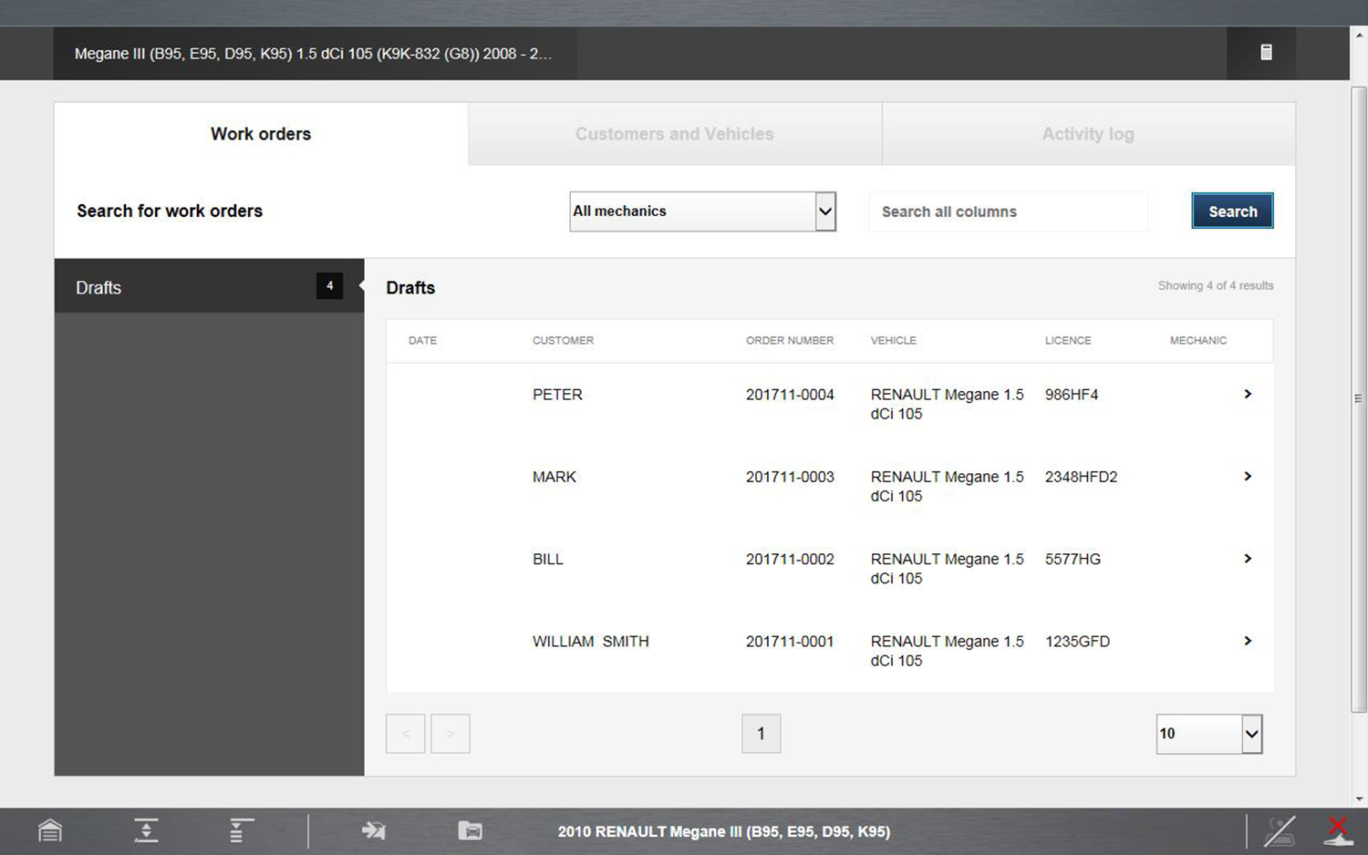A list of the last ten vehicles selected is displayed. Vehicle records that include work orders are displayed with the work order number.