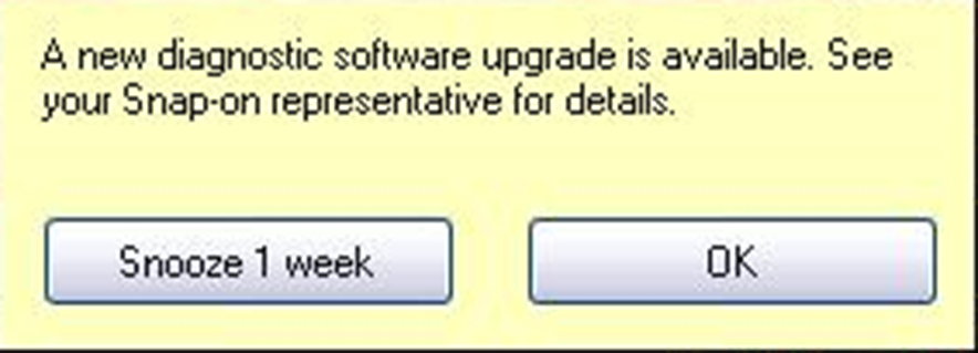 Approximately 30 days before expiration, a message will be displayed as a reminder to keep your software current and retain your Snap-on Information access. Selecting OK will close the message and selecting Snooze 1 Week will close the message box for approximately one week and then it will re-appear.