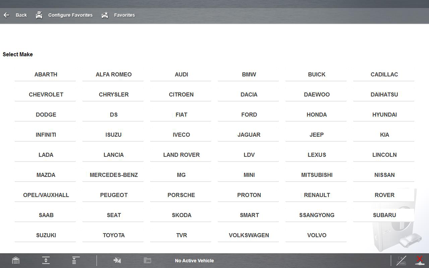 | 1. | From the Vehicle Make selection screen, select the vehicle make (manufacturer). |
