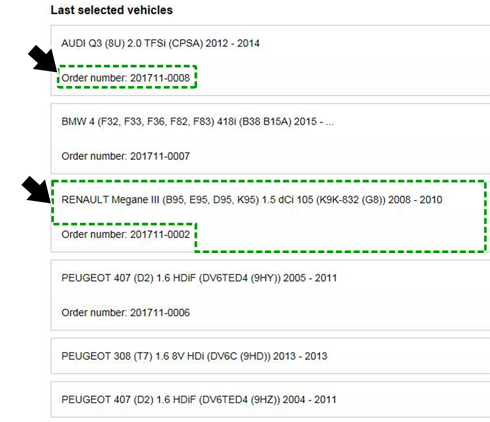 To Choose a Previously Selected Vehicle or Open a Saved Work Order Select Last Selected Vehicles from the vehicle make menu.