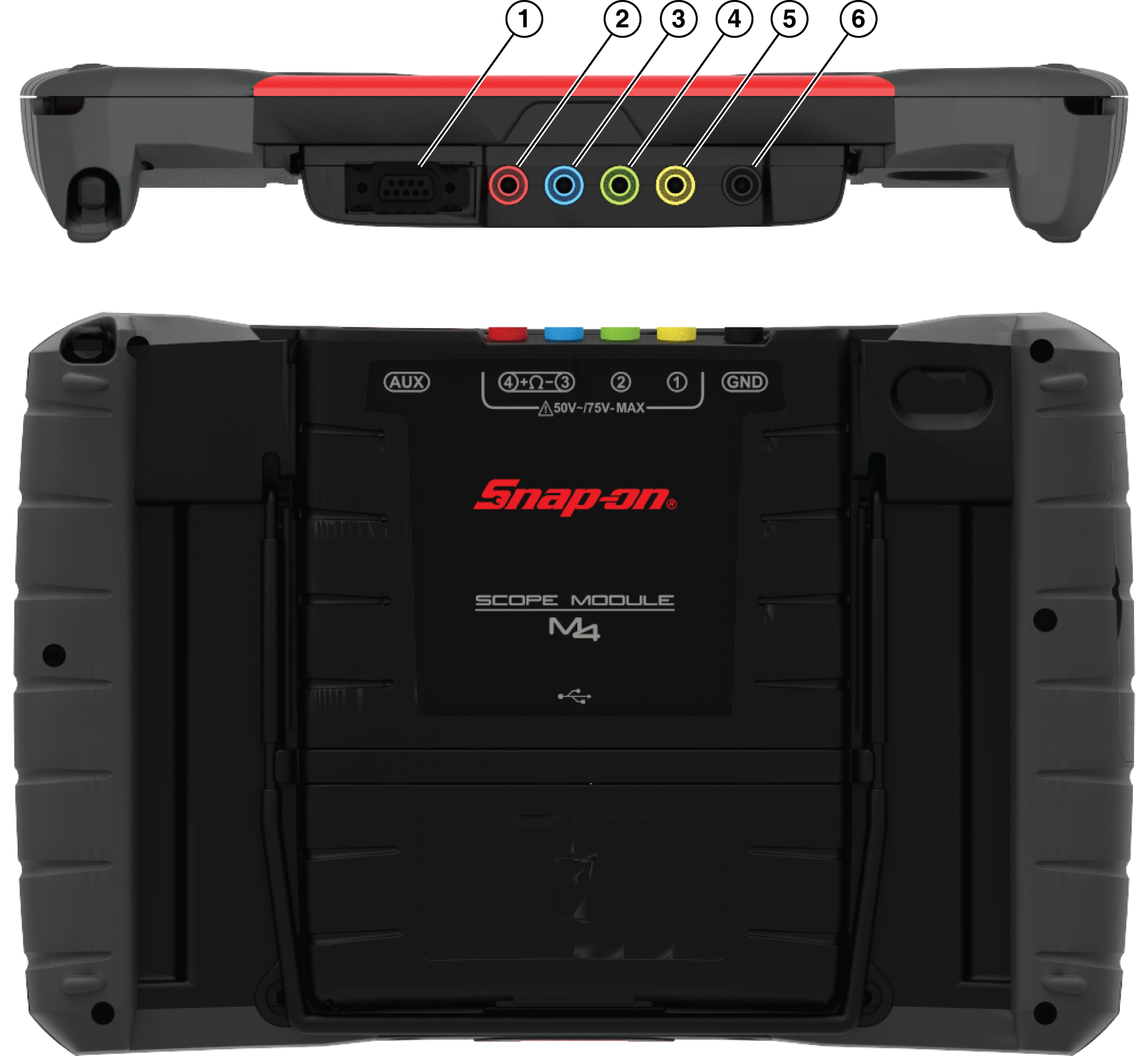 | 1. | Auxiliary (DB9) Connector The auxiliary connector is used for connection of the optional RPM inductive pickup and the pressure transducer split lead adapter. For additional information contact your sales representative, and see Using the Scope Module Extension Cable. |