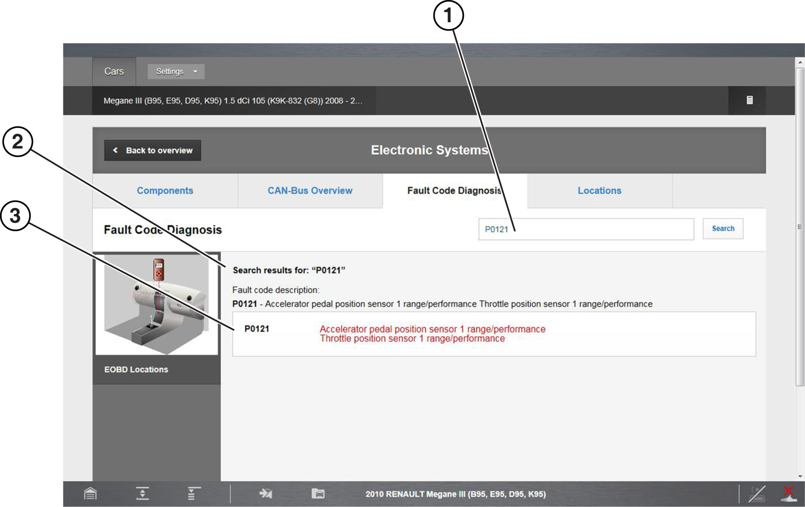 The Locations features provides vehicle specific electrical component location information. Descriptive and visual (e.g. diagrams and schematics) reference may be provided for the following types of system components: