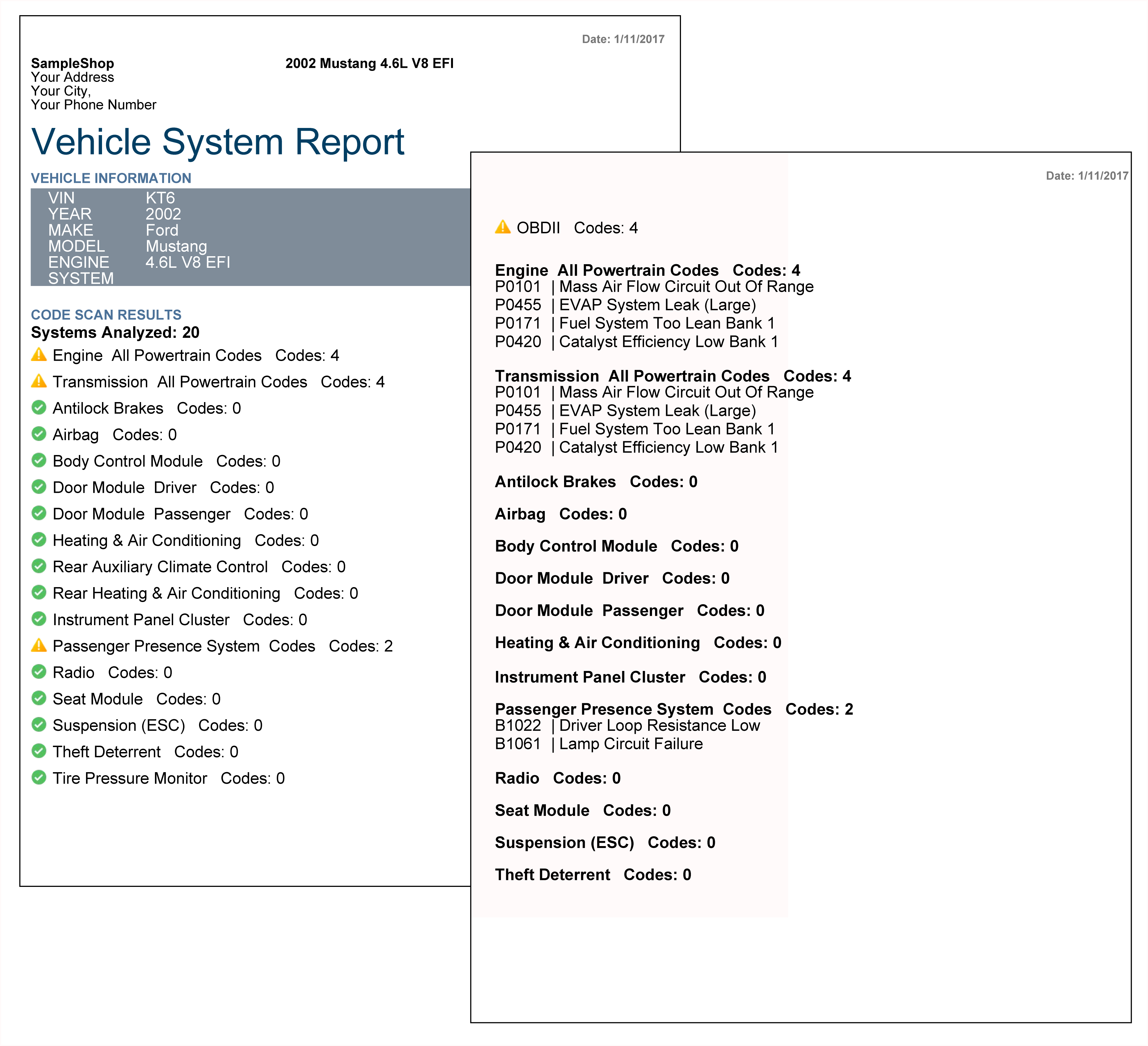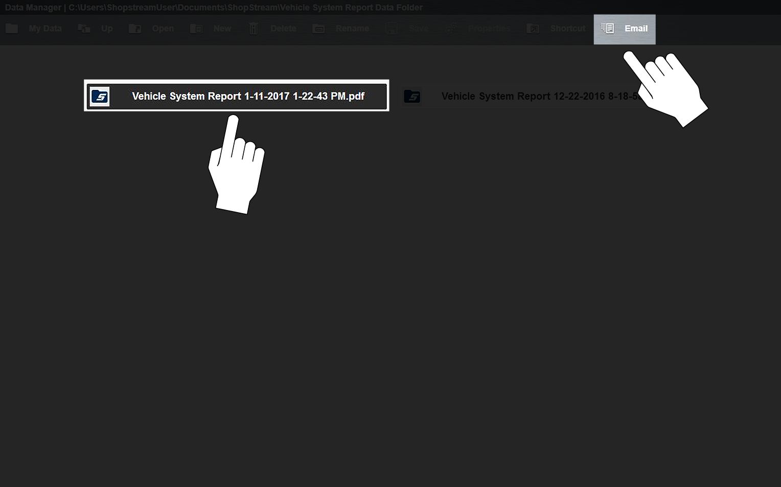 Code Scan reports are saved in .pdf format and are viewable by opening them from the Vehicle System Report Data Folder in the Data Manager folder panel, or from within the Vehicle System Report Data folder in the Windows My Documents > ShopStream folder.