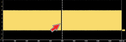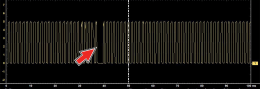 2 - Pause data capture and then zoom out (this example is at 32X) to see more data and to possibly find a glitch. In this example the cursor has been placed on the right side of a glitch. The waveform is too compressed to see any detail, however the glitch stands out as a thin dark area in the waveform.