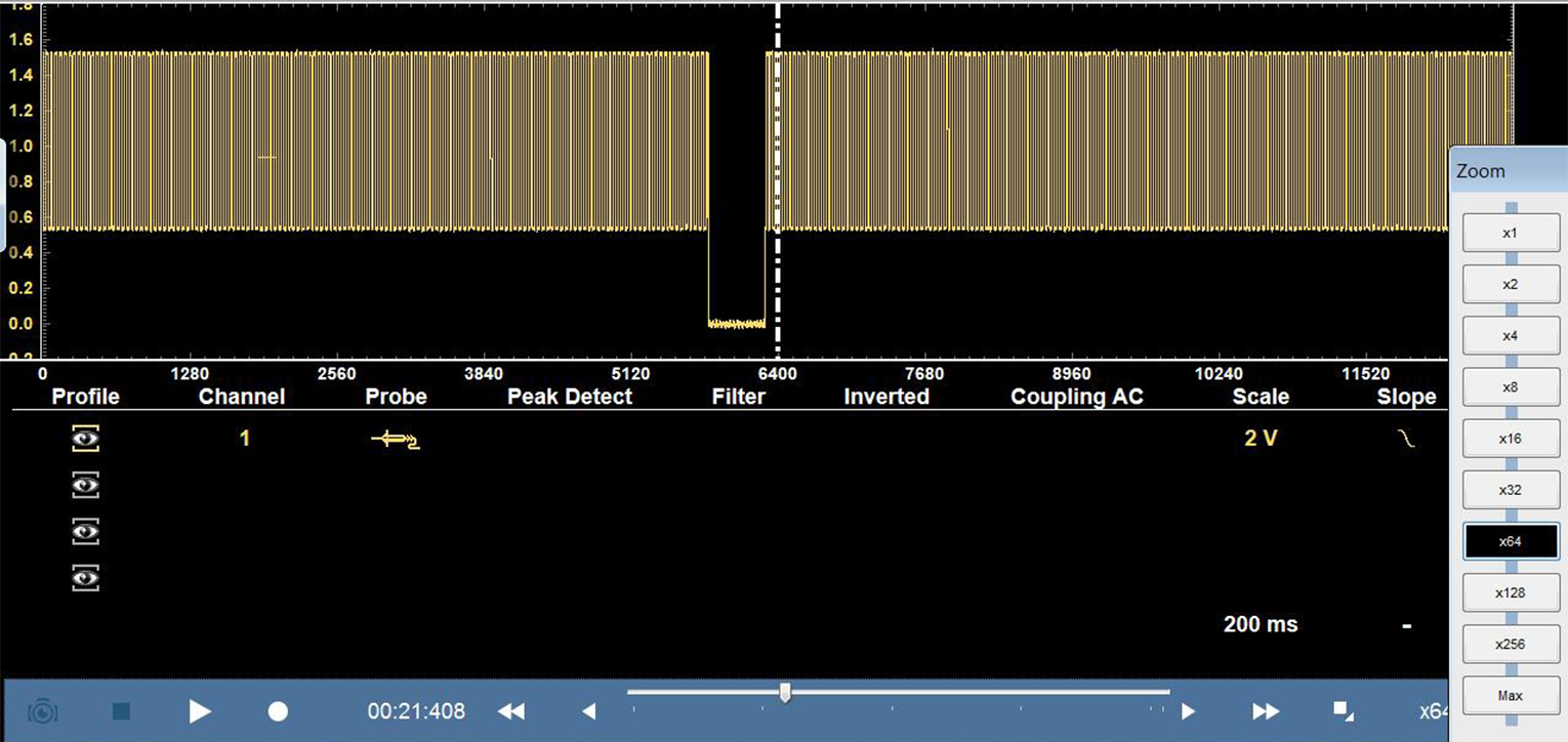 When zoom levels of 2X and higher are selected, a Zoom cursor (vertical dashed line) (Figure Above) displays onscreen. The cursor is used to quickly mark and navigate to points of interest or glitch in a captured waveform.