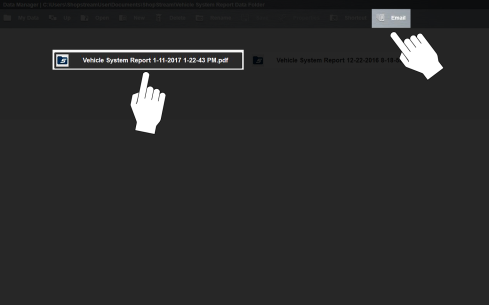 | 1. | From the Data Manager main screen, select a file from within one of the folders (e.g. Camera, Scanner Data, Scope Multimeter, etc). In this example (Figure 12‑3). a Vehicle Systems Report was chosen from the Vehicle Systems Report Data Folder. |
