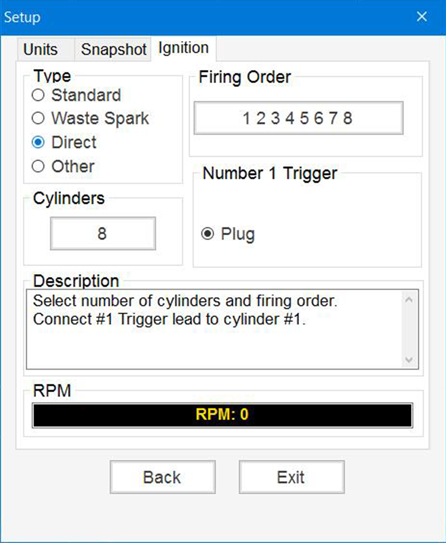 Single Cylinder Ignition - configures the unit to connect to an individual cylinder using a fixed time sweep when a lead is not available to connect to all cylinders.
