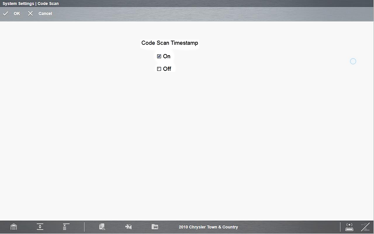 The System Settings icon is located on the Home screen. This feature opens a menu of options (Paired Devices, Shop Information, Data Backup, and Code Scan) to assist you in pairing the Compact Scan Module, create and edit your shop contact information, backing up or restoring your saved data, and setting the display option for the Vehicle System Report timestamp.