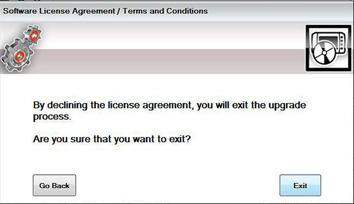 To Decline: at the screen prompt select I Decline. A confirmation message is displayed providing options to Go Back or Exit the software installation.