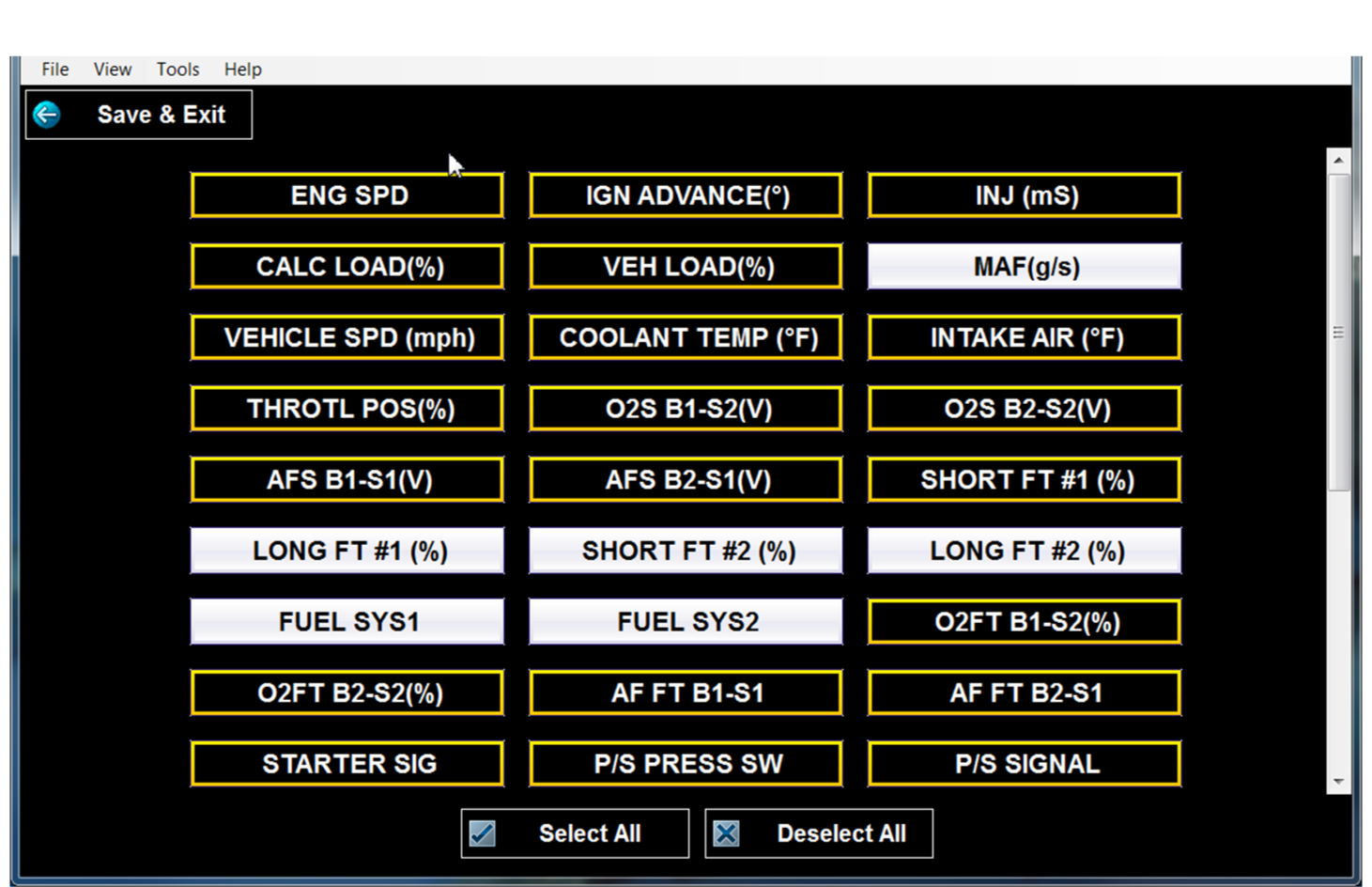 | 3. | Select the parameters to include in your custom list. Select All and Deselect All controls are also available to assist in the selection process. |