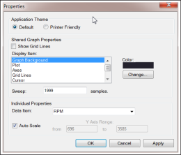 The Tools menu opens the Properties dialog box which has two sections ; Shared Graph Properties and Individual Properties. Shared Graph Properties apply to all graphs, and Individual Properties apply to the selected graph only.