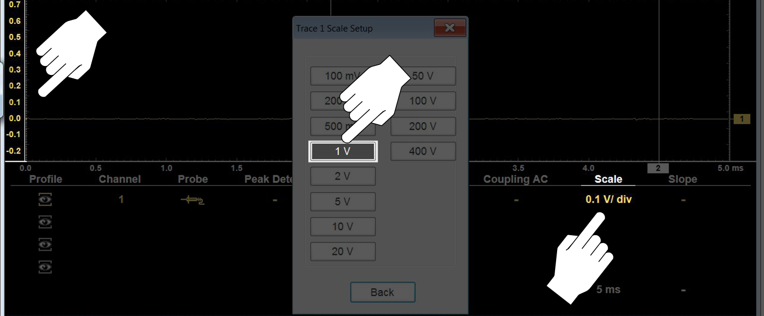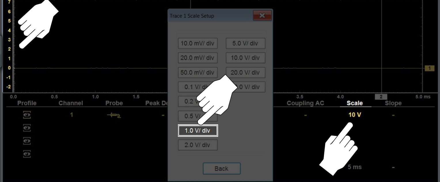 Trace Per Division - changes the dropdown vertical scale menu selections to ##/div mode, which in turn changes the vertical scale to represent ## by division.