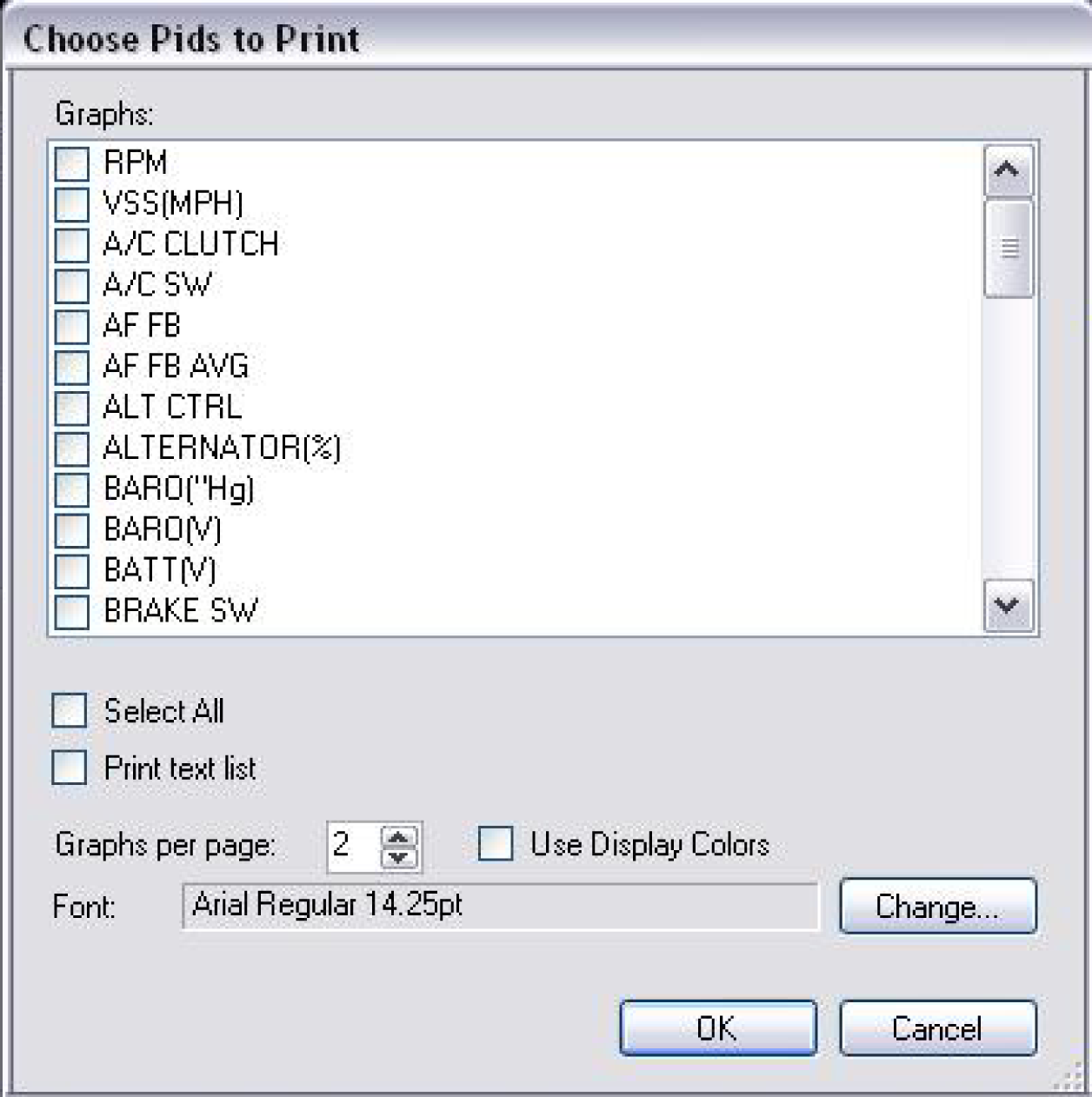 When Print or Print Preview is selected, a dialog box opens and allows you to define the printed output. Print settings include, print as graphs or text, which pids to include, number of pids per page, display colors, and the text font.